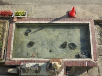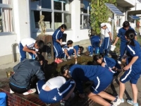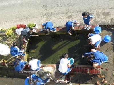 保健環境委員会は、校庭横にある金魚の池を掃除しました。