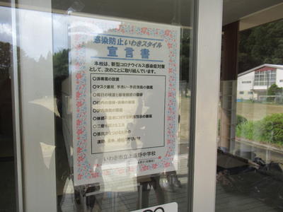 このほど、いわき市新型コロナウイルス感染症対策本部事務局より、学校における「感染防止いわきスタイル宣言書」の作成及び掲示依頼があり、本校では下の写真のとおり作成し、玄関に掲示しました。