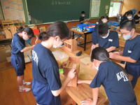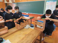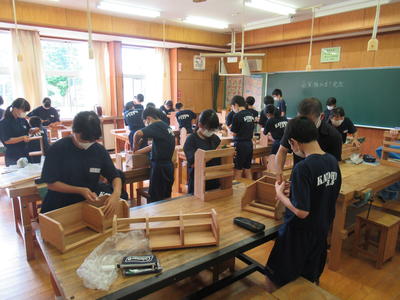 が目標です。3校時の前半におじゃましましたが、ほとんどの生徒は組み立てが完成し、紙やすりで仕上げを行っています。世界に一つだけのオリジナルな木工作品ですが、なかなかの出来映えとなっています。
