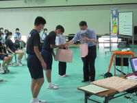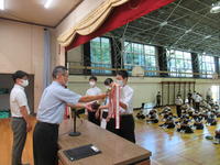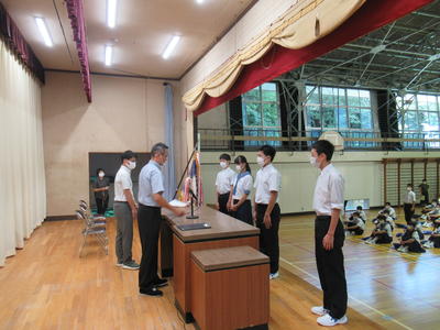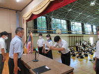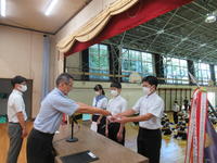 最初に、夏休み中の市中体連バドミントン大会の表彰を行いました。