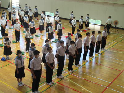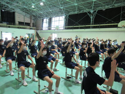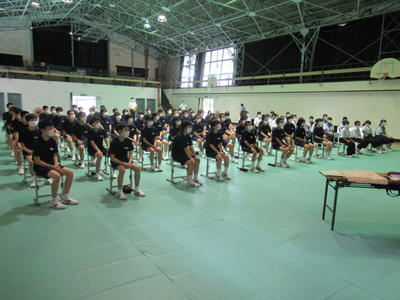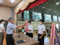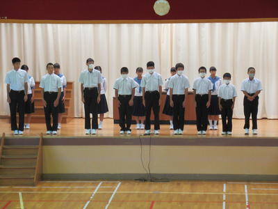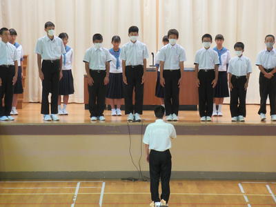 ◇ 校長式時(全文)「まずは今日、皆さんに会うことをとても心待ちにしていました。こうして、元気な顔を見ることができて、大変嬉しく思います。今年の夏休みは、新型コロナウイルス感染症の影響で、7月中は授業が行われたり、部活動の各種大会が中止となったり、3年生の体験入学も、中止や期日変更などがあり、これまでとは違う特別な夏休みでした。しかし、そのような中にあって、先ほど表彰も行いましたが、7月から8月にかけて行われた市中体連大会では、3年生中心にチームが一丸となって、最後まで熱い戦いを繰り広げ、大きな感動を味わうことができました。また、駅伝大会や英語弁論大会に向けたひたむきな練習、創作部による文化祭のビッグアートの制作、新人大会に向けた1・2年生による部活動がスタートするなど、皆さんの努力を続けるすばらしさを、様々な場面で見ることができました。さて、いよいよ2学期が始まります。まだまだ、制限や不自由さを感じる、不安な日々が続きます。しかし、このような状況だからこそ、「学校って楽しいな。」「皆と一緒に頑張って良かった!」と、皆さん一人一人が心から感じられるような教育活動を、先生方全員で知恵を出し合い、工夫しながら創り上げていきたいと思います。皆さんも、学級やチーム・個人の目標が達成できるよう、日々の努力を惜しまず過ごすことを願い、式辞といたします。」