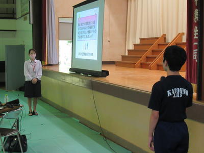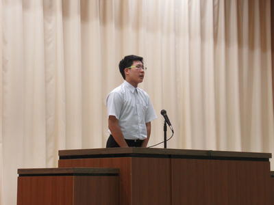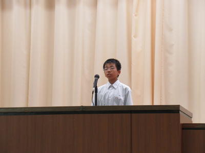 今週の27日(木)、中央台南中学校で行われる市中学校英語弁論大会に、本校代表で出場する生徒の全校生の前での発表が、始業式に引き続き行われました。