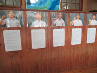 昇降口前廊下には、立候補者5人の顔写真と決意が掲示されています。