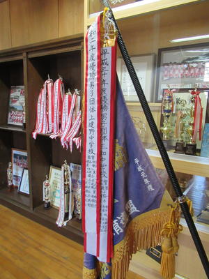 昨日表彰を行った、市中学校体育大会バドミントン競技大会の、男子団体の優勝旗、男子個人シングルス・男子個人ダブルスの各トロフィーに、名前等を記載したペナントを付けて、全校生が目にする昇降口から入ったところに設置しました。来校された際、是非ご覧頂ければ・・と思います。