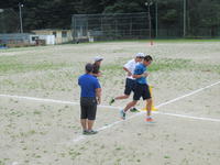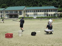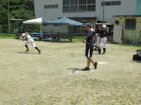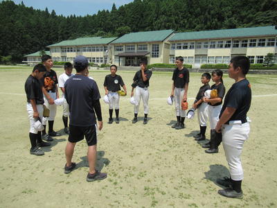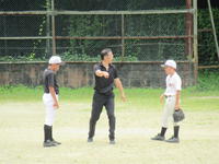 野球部の練習の様子です。教頭が、守備の動きや牽制についてアドバイスをしています。