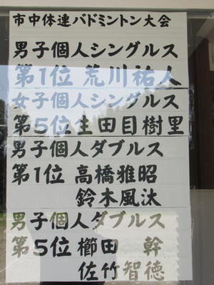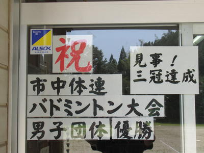 玄関先に、陸上に続いて、先日のバドミントン部の市中体連大会での活躍を表示しました。(教頭作)