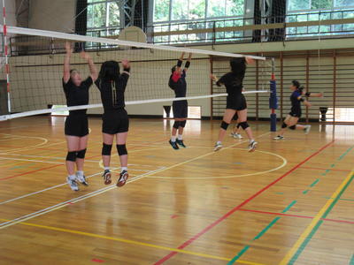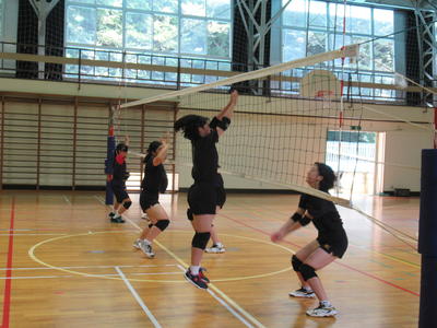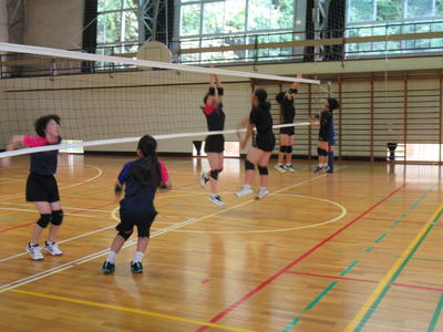 バレーボール部は午後からの練習です。体育館におじゃましたときは、3箇所で、スパイクとブロックの練習をしていました。2年生3名、1年生3名の少人数ですが、懸命に頑張っています。