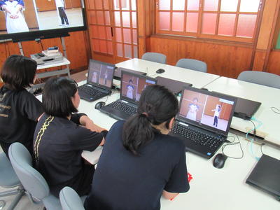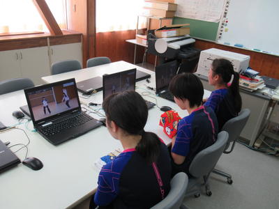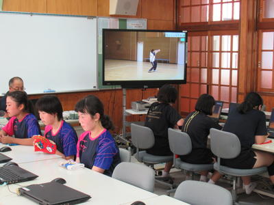 その後、体力回復を兼ねて、コンピュータ室でバレーボールのDVDを見ています。サーブカットやスパイクレシーブの際の腕の位置や移動する際の目の位置など、わかりやすく解説されています。練習の中で、すぐにでも試せそうですね。