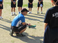*顧問が、靴紐がほどけない結び方を実演しています。