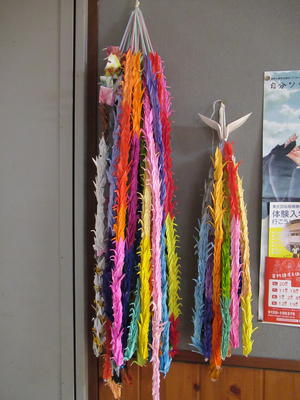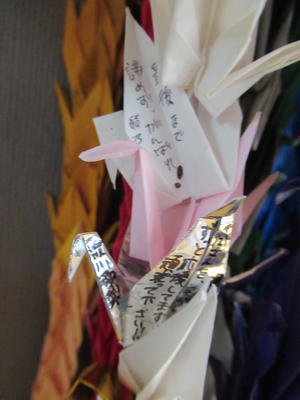 先週の金曜日は、気持ちのこもった素晴らしい応援で壮行会を盛り上げた創作部ですが、1階3年生教室前廊下に、写真にある千羽鶴が掲げられています。これは、創作部の生徒が部活動の時間を使って頑張って折りあげたもので、よーく見ると、メッセージが書かれています。ここにも創作部の皆さんの仲間を応援する気持ちが感じられます。