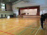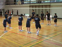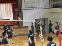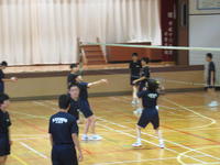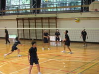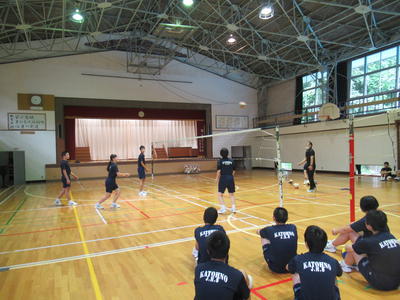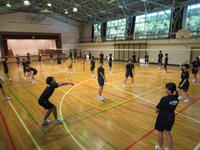 バレーボールの授業2時間目です。教科担当が、ゲームでボールがつながるよう、班での練習方法のモデルを示しています。(反対側コートから軽くボールを打ち、それをセッターに上げて打つ練習)