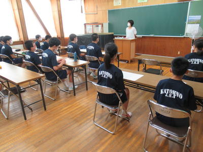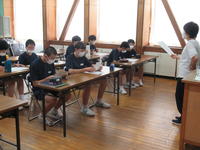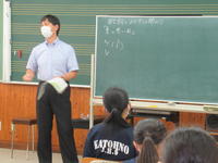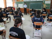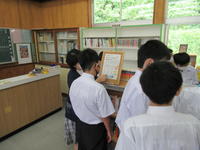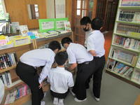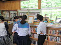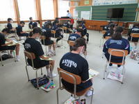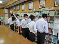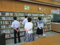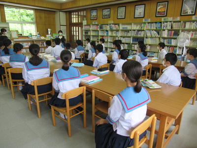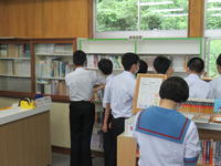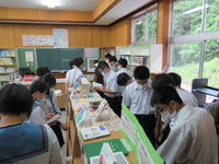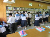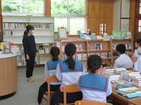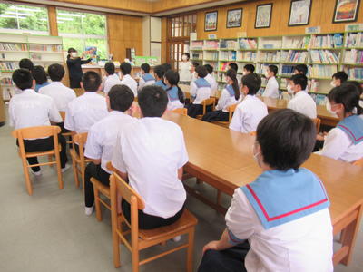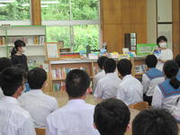 1校時は1年生の授業です。課題図書3冊の紹介後、教科担当が昨年度の課題図書や、夏休みの本の貸し出しについて説明しながら、本(作品)に触れることで得られることや、後日「本の紹介」をしてもらうことなども話しています。