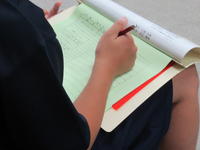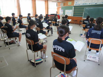 その後、「言葉と旋律との関わりを生かして:夏の思い出」について、教科担当が、八分休符やブレスを意識して歌うことを説明しています。さて、実際歌ってみるとどうかな・・?