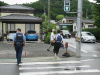 今朝の、学校入り口における子どもたちの登校の様子です。毎朝交通指導にあたってくださっている上遠野小学校の校長先生に加え、今朝は、遠野地区交通安全対策協議会の方、上遠野小学校交通安全母の会の方、遠野駐在所の髙津巡査部長も横断歩道付近に立ち、交通安全の呼びかけをしてくださいました。