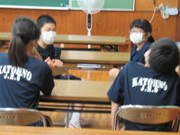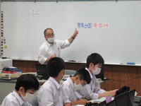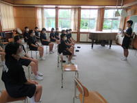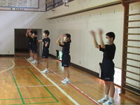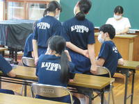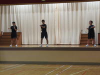 先週決めた役割分担に基づき、入場から、1拍子→2拍子→3・3・7拍子、各部へのエールなど、一連の流れを確認しました。初めてのため担当教師が見本を示しながら、生徒たちは一生懸命応援練習をしていました。