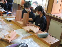 デザインTシャツの製作です。ミシン縫いや手縫いを一生懸命やっている生徒、縫う作業は終了し、プリントするデザインをどうしようか考えている生徒、全て終了して学習ノートをまとめている生徒もいます。