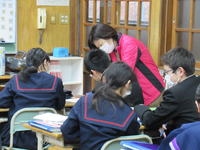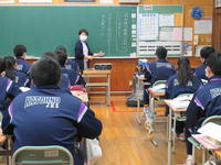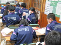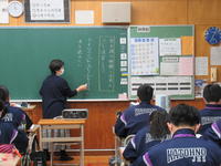 教科担当が、2つの考え方をした生徒にそれぞれ黒板に書かせ、それを確認しながら、2つの方法を試してみることや、どうやってやればいいか考えてみるよう話しています。答えに至る方法は1つではないことに気付くことも大切ですね。