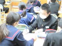 「空間図形」の単元、プリントで、円錐の展開図を見て、「側面にあるおうぎ形の半径と弧の長さを求めよう」「おうぎ形の中心角を求めよう」の問題に取り組んでいます。周囲と相談しながら、教え合ったりしています。