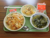 給食メニュー → キムチチャーハン 牛乳・コーヒー 揚げワンタン 野菜スープ