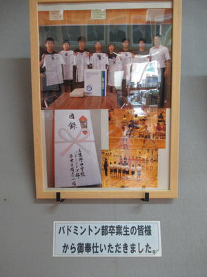 夏休み中に、バドミントン部卒業生有志の方々より、ユニフォームをはじめとする多大なる御奉仕をいただいたことにつきましては、先にHPでもご紹介いたしましたが、このほど、学校での贈呈式や、新しいユニフォームを着て東北大会で戦っている場面の写真を額に入れて、職員室前廊下に掲示いたしました。
