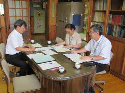 本日午前、いわき市総合教育センターの宮内憲司研修調査室長と黒津牧花指導主事が来校され、11月14日(木)に本校で予定されている、初任者研修(今年度いわき市内の中学校に採用された15名の先生方の研修)の打合せを行いました。当日は、授業参観や研究協議の他、給食や清掃時には各学級に入って、子どもたちと会食したり清掃を行ったりする予定です。