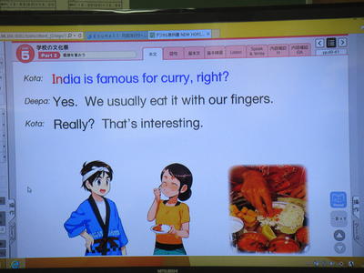 デジタル教科書を使い、読み(Reading)の練習をしています。デジタル教科書を使うと、文章を読む模範音声が出るので、それに続いて生徒たちが読む練習を、繰り返し行うことができます。また、読む文章の部分が赤色で表示されるので、とてもわかりやすいのも特徴です。現在、市内の中学校では、英語と理科の授業にデジタル教科書が導入されています。