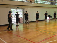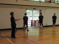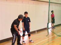 壁打ちから対人レシーブを繰り返し練習しています。その後、ダッシュしてセンターラインをタッチし、バック走で戻る→サイドステップ→クロスステップ・・と、基本の徹底した反復練習をしています。
