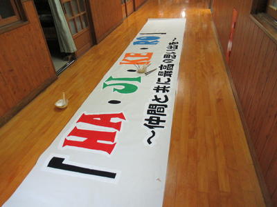 創作部では、夏休み期間中に制作したビッグアートに加えて、現在、部活動全体と個人で出展するものについて考えています。本日、ちらっとおじゃましたところ、廊下に紅葉祭のテーマを広げて、手直しをしていました。
