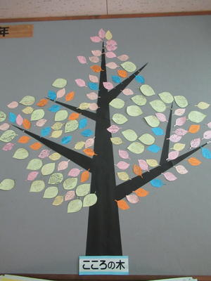 2年生教室前廊下にある「こころの木」、これまでも何度かHPに登場しましたが、2学期を迎え、更に生い茂ってきました。一枚一枚の葉には、子どもたちの様々なメッセージが書かれています。