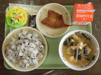 給食メニュー → しそひじきごはん 牛乳 あじフライ・ソース もやしと油揚げのみそ汁 はちみつレモンゼリー
