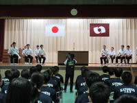 最初に、先週土曜日のジュニア陸上選手権大会でC100M5位に入賞した、1年加藤篤志くんの表彰を行いました。