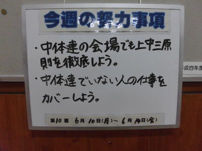 放送室前に掲示されている「今週の努力事項」です。いよいよ中体連総合大会が近づいてきました。