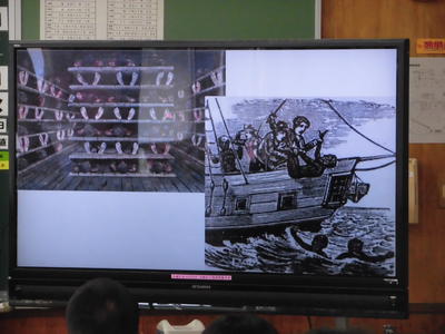 「ヨーロッパの世界進出の影響を説明しよう!」の課題で、大航海時代におけるヨーロッパ諸国の世界進出の目的や貿易の様子を、モニターを使い考えさせる授業。