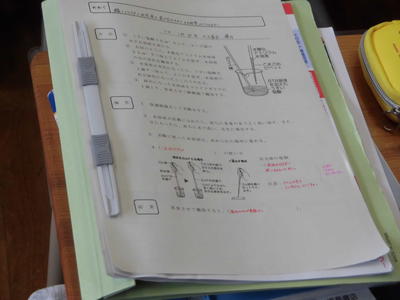 「酸性とアルカリ性の正体とイオン」の単元。「酸性とアルカリ性の水溶液を混ぜ合わせるとその性質はどうなるか?」の実験結果を導き出す授業です。酸性とアルカリ性の強さを表す値である「PH」(ペーハー)について学習し、プリントに実験結果を書いていました。