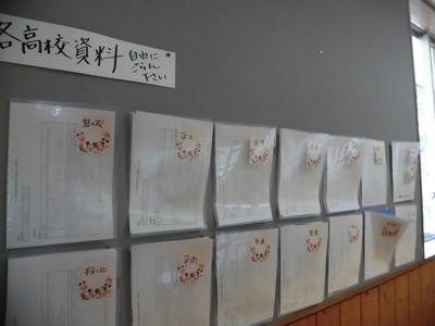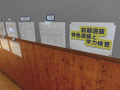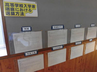 各学年の廊下には、市内の県立高校ごとに、選抜方法一覧が掲示されています。(募集定員枠、志願してほしい生徒像、選抜資料等)自分が行きたい高校の資料は、しっかりと確認しましょう!