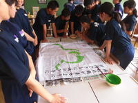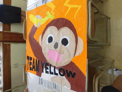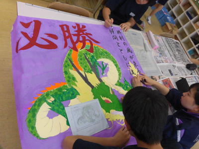 「赤」チームと「緑」チームが、チーム旗にチームカラーの着色をしていました。