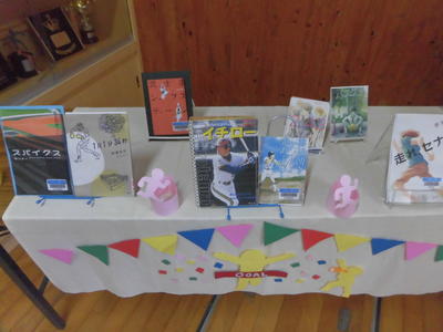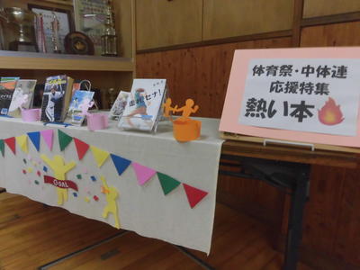 昇降口を入った1階のスペースに、「体育祭・中体連応援特集~熱い本~」と題して、ひたむきにスポーツに取り組む主人公を題材とした本が、数冊並べられています。