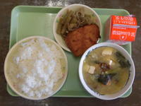 給食メニュー→ ごはん 牛乳 かれい竜田揚げ ふきとこんにゃくのみそ炒め