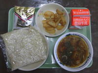 給食メニュー→しょうゆラーメン(中華ソフトメン) 牛乳 新じゃが芋のフライドポテト 小魚