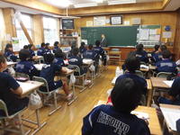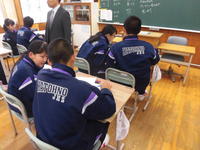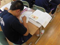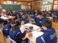 「二通の手紙」の資料を使い、「どんな場面でもきまりは優先されるべきなのか」を考えました。今日の授業者は教頭先生です。和やかな雰囲気の中で、生徒は個別にワークシートに考えを書いたり、ペアやグループで意見交換するなどして、真剣に取り組んでいました。
