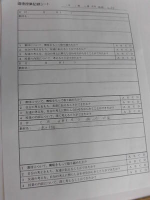 〔本校で使用している『道徳授業記録シート』:生徒の学習の積み重ねがわかります〕