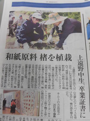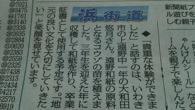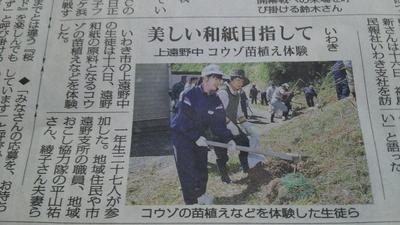 今朝の「福島民報」いわき版に、先日の一年生が行った、和紙の原料となる楮(こうぞ)の植え付け作業の様子が紹介されました。