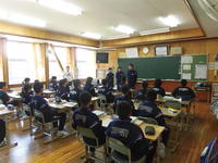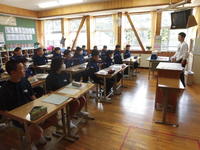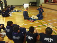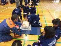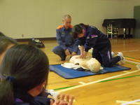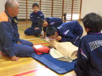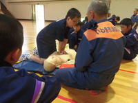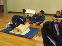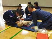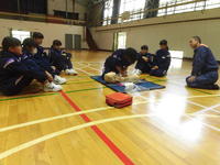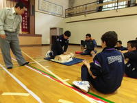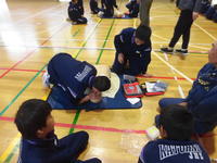 今日の2・3校時、遠野分遣所長様他4名の職員の方々にお出でいただき、1年生を対象にした「救命救急講習会」が体育館で行われました。