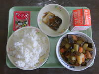 給食メニュー→ごはん 野菜ふりかけ 牛乳 さばのみそ煮 五目豆