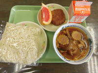 給食メニュー→山菜うどん 牛乳 メンチカツ・ソースかけ グレープフルーツ
