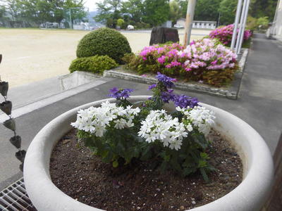 子どもたちや来校者を迎える玄関先にある草花が、新しくなりました。