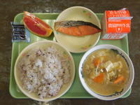 給食メニュー→雑穀ごはん きくらげのり 牛乳 鮭塩焼き 呉汁 グレープフルーツ