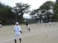 〔野球部:ウォーミングアップの基礎トレです。1年生も本格的に活動しています。〕