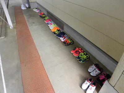 体育館入口前にきちんとそろえられたシューズ。本校では、このようなことも部活動をとおして学ばさせています。