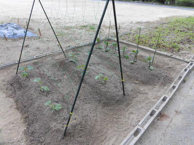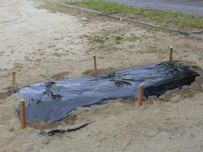 昨日、1年生の技術の授業で、小校庭西側に「ナス・キュウリ・スイカ」を植えました。